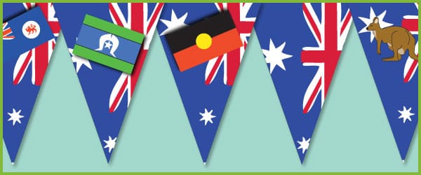 Printable Australia Day themed bunting, simply cut out and string together to decorate your classroom for 26th January.
