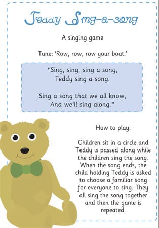 A fun Early Years game that encourages all the children to get involved during circle time. The children sit in a circle and sing the Teddy Bear song to the tune of Row, Row, Row your Boat, whilst passing round a teddy bear. When the song finished whoever is holding the bear gets to choose the next song.