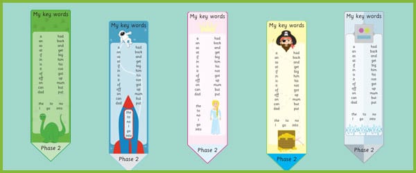 A set of bookmarks featuring the high frequency words found in Phase 2 of the Letters and Sounds Programme. This resource features 5 different book mark designs, including princesses, pirates, robots, rockets and dinosaurs. They are ideal for helping children become more familiar with their Phase 2 high frequency words.
